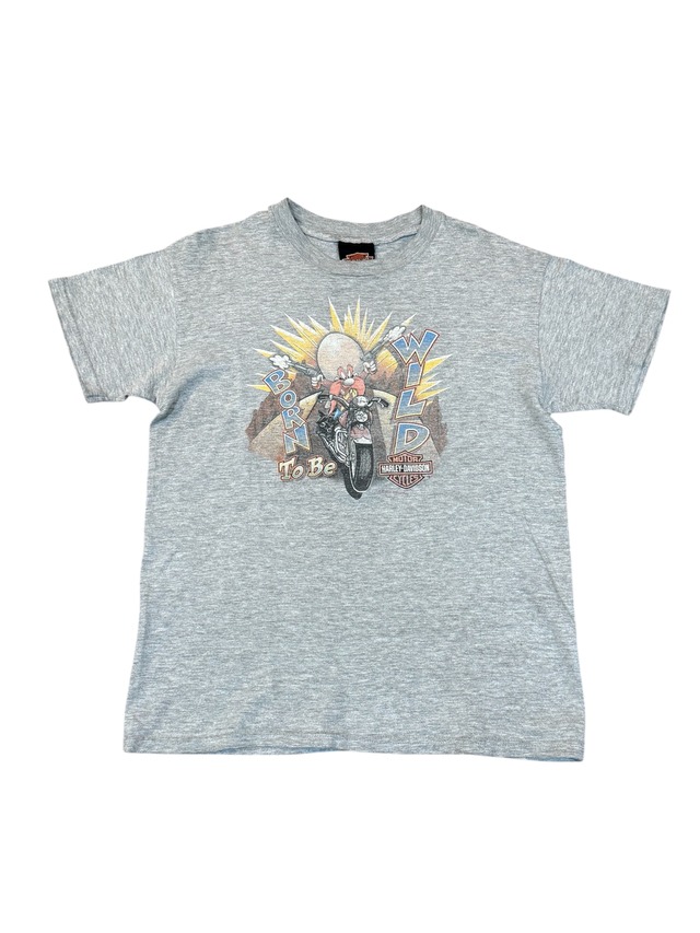Harley-DavidsonとLOONEY TUNESの貴重なコラボレーションアイテム。 フロントには、二丁拳銃をぶっ放しながらハーレーで爆走する「ヨセミテ・サム」が、"BORN TO BE WILD"のテキストと共に描かれた最高にパンチの効いた一着です。 バックにはオクラホマ州スティルウォーターのショップロゴが入る豪華な両面プリント仕様。ボディは厚手でタフな「Hanes BEEFY-T」 表記はキッズMですが、身幅45cmほどあるため、お子様はもちろん、小柄な女性がコンパクトなサイズ感でタイトにも着こなせます。 コレクションとしても、実用的なウェアとしても、間違いなく自慢できるスペシャルなピースです。 【SIZE】 表記サイズ M(10-12) 実寸をご確認下さい。 着丈 : 53cm 身幅 : 45cm 肩幅 : 42cm 袖丈 : 13cm 【素材】 90% COTTON 10% POLYESTER 『Attention』 ・写真をご覧頂きダメージや汚れ、色合い等気になることが御座いましたらお気軽にお問い合わせください。 ・測定値の多少の誤差はご了承ください。