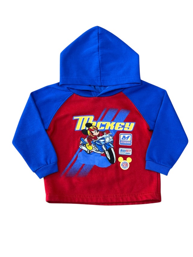 バイクにまたがるミッキーがとってもクール! 鮮やかなレッドとブルーのバイカラーが目を惹く、ディズニーフーディーです。 「Mickey RACER」のロゴやモータースポーツ風のワッペンデザインが、心をくすぐる一着。 ラグランスリーブなので、活発に動くお子様でも肩周りが楽ちんです。 24Mサイズ(80-90cm相当)なので、1歳〜2歳頃のお子様に。 ディズニーランドへコーデや、ギフトにも喜ばれるアイテムです! 【SIZE】 表記サイズ 24M(80cm-90cm程) 実寸をご確認下さい。 着丈 : 31cm 身幅 : 32cm 肩幅 : -cm 袖丈 : 33cm ラグランスリーブの為、肩幅測定無し。 【素材】 87% POLYESTER 13% COTTON 『Attention』 ・写真をご覧頂きダメージや汚れ、色合い等気になることが御座いましたらお気軽にお問い合わせください。 ・測定値の多少の誤差はご了承ください。
