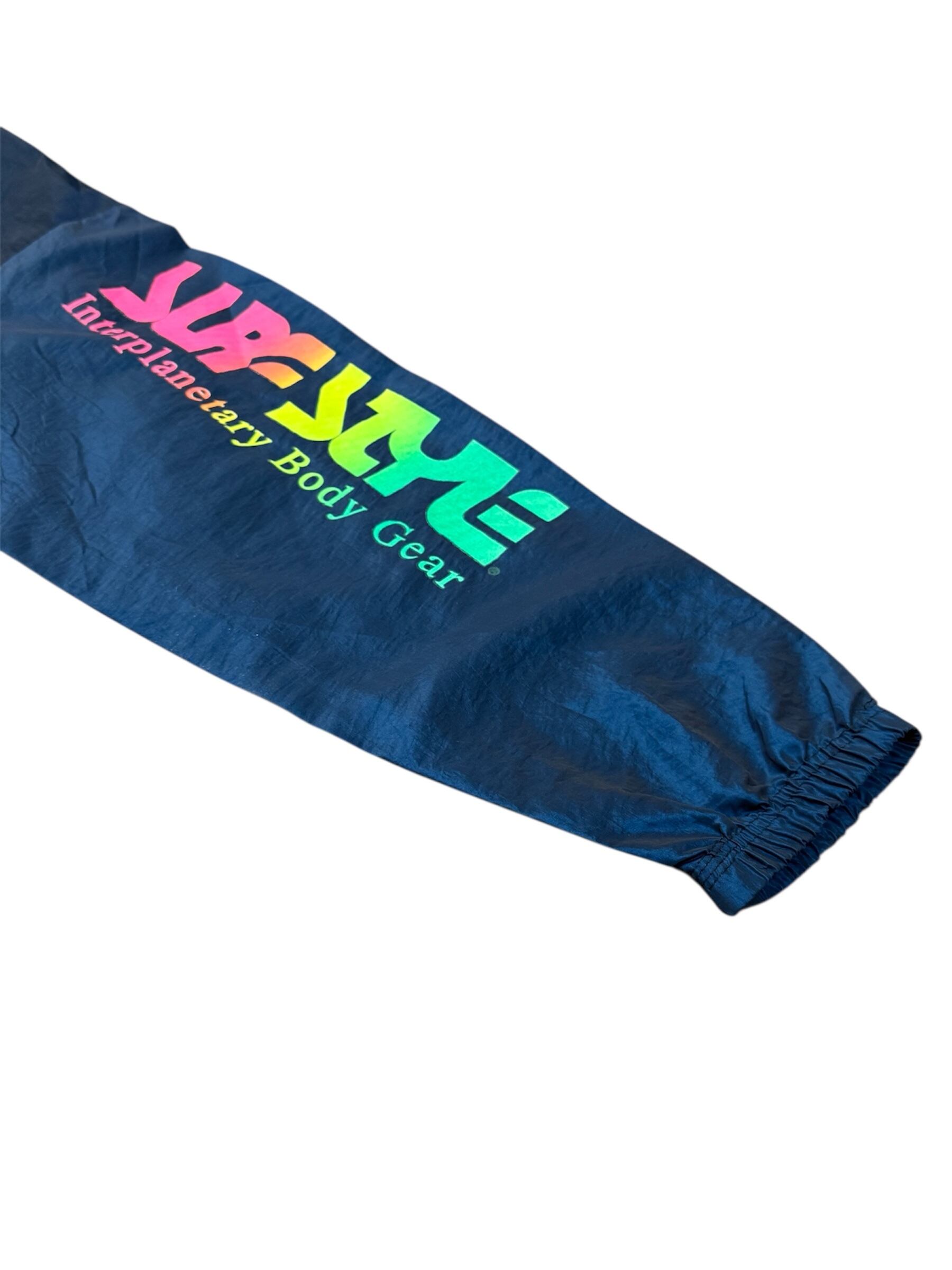 ネイビー、ブルー系の光沢カラーのポリナイロン生地に、胸、襟にグラデーションロゴプリントが目を引くジャケットです。
