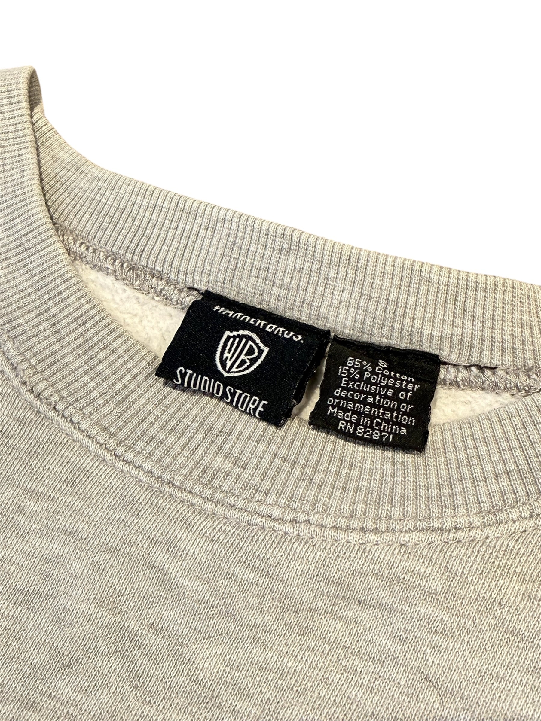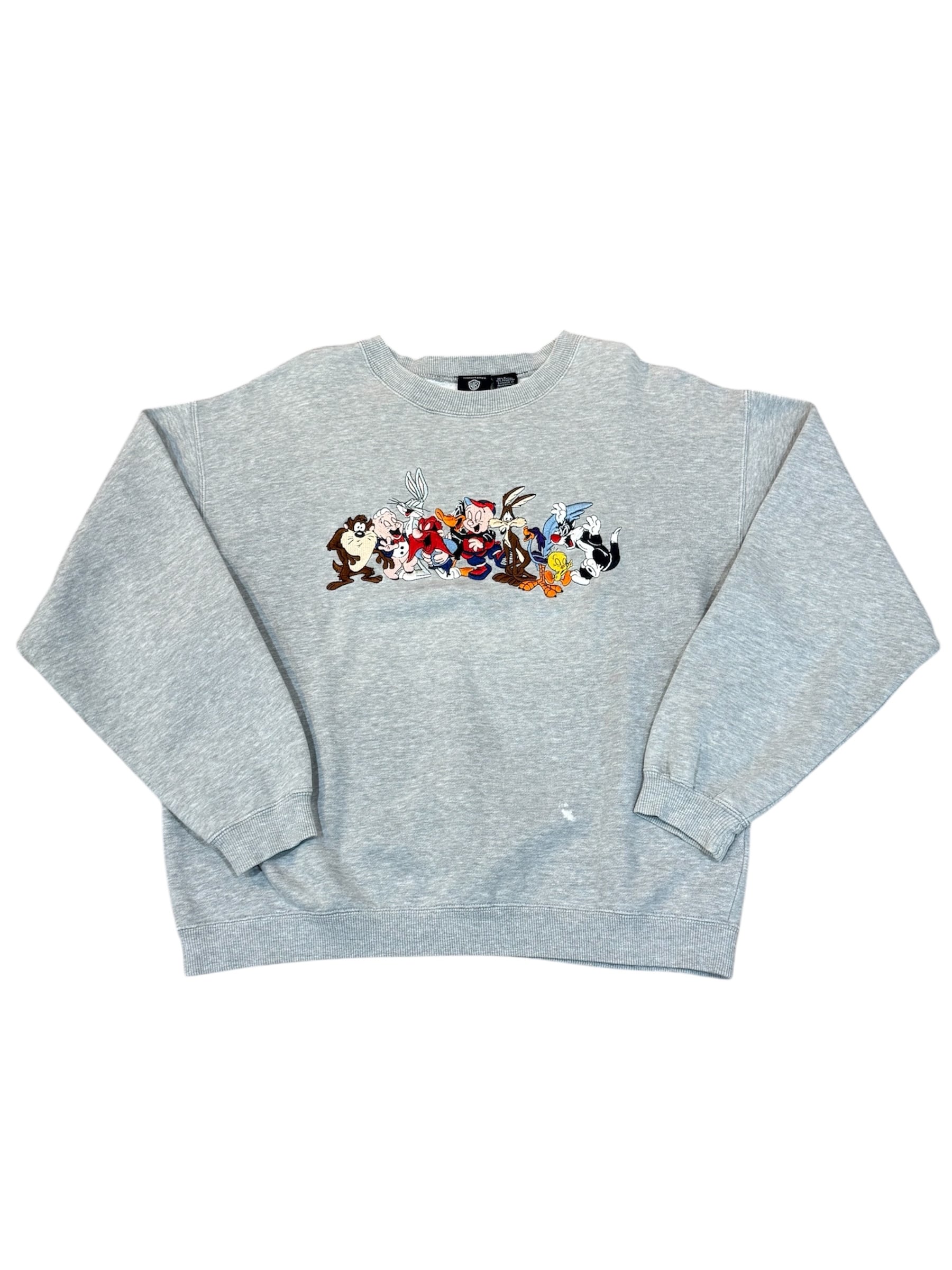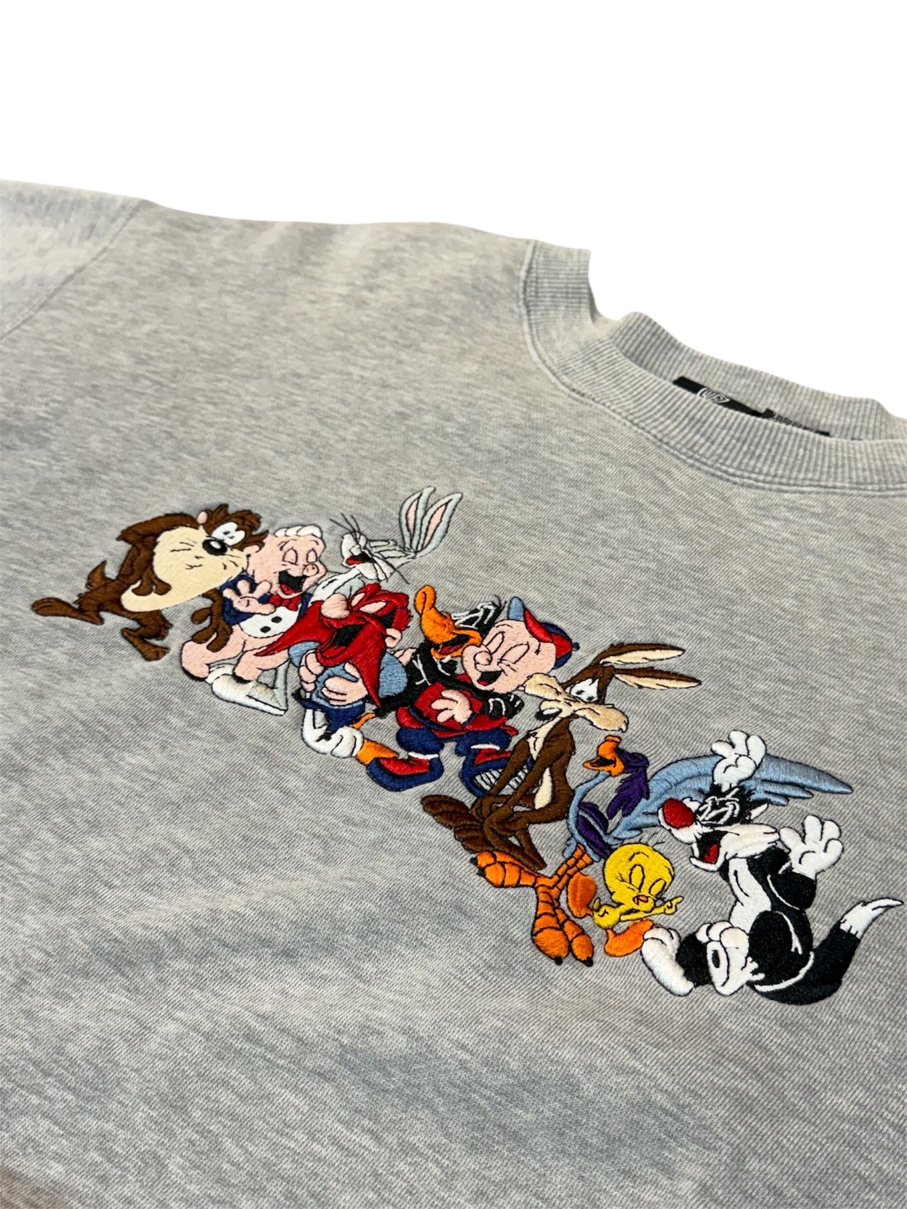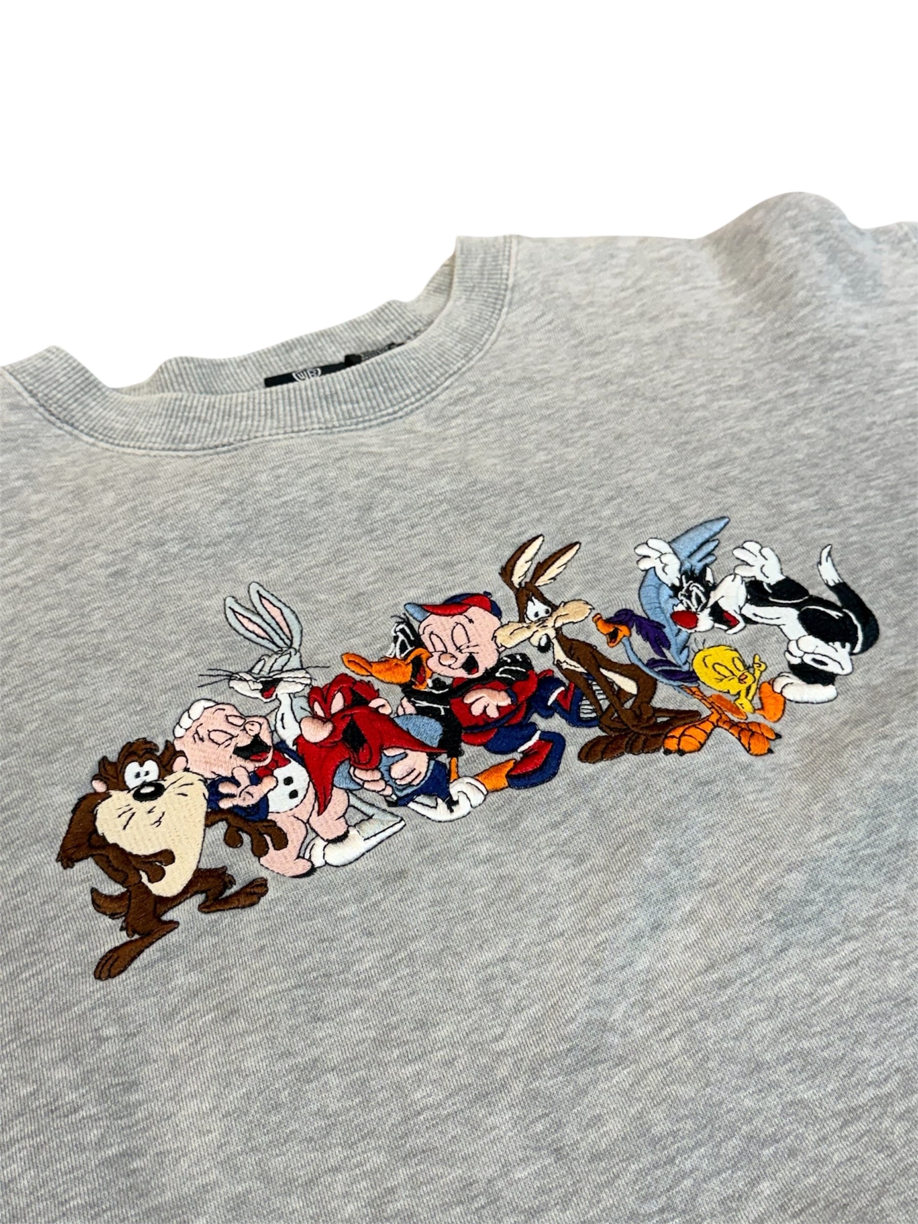 バッグス・バニー、タズマニアン・デビル、トゥイーティーなど、ルーニー・テューンズの仲間たちが勢揃いした豪華な刺繍が目を引くスウェット。