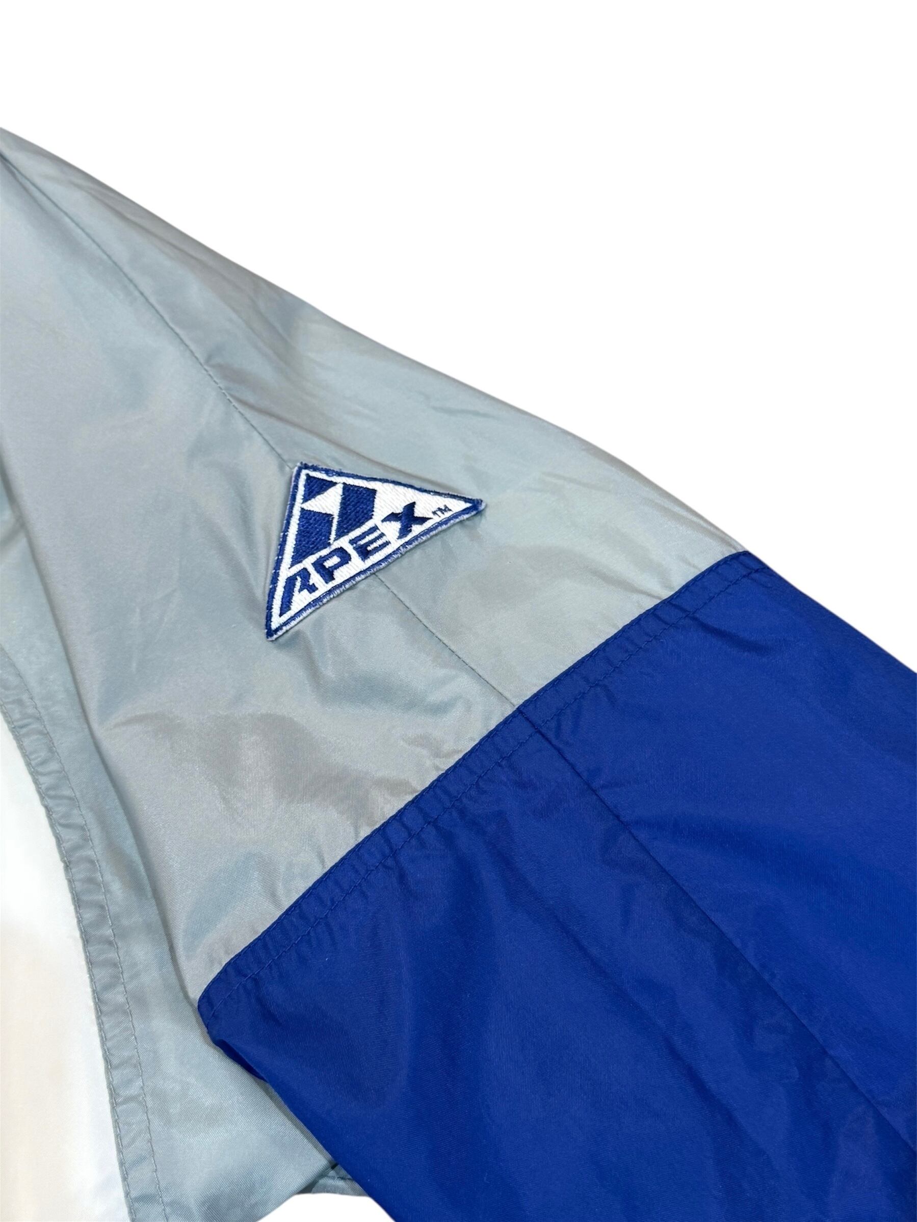 90年代に展開されていたAPEX ONE製の一着で、白・青・銀を組み合わせた当時のスポーツウェアらしい大胆な切り替えデザインが目を引きます。