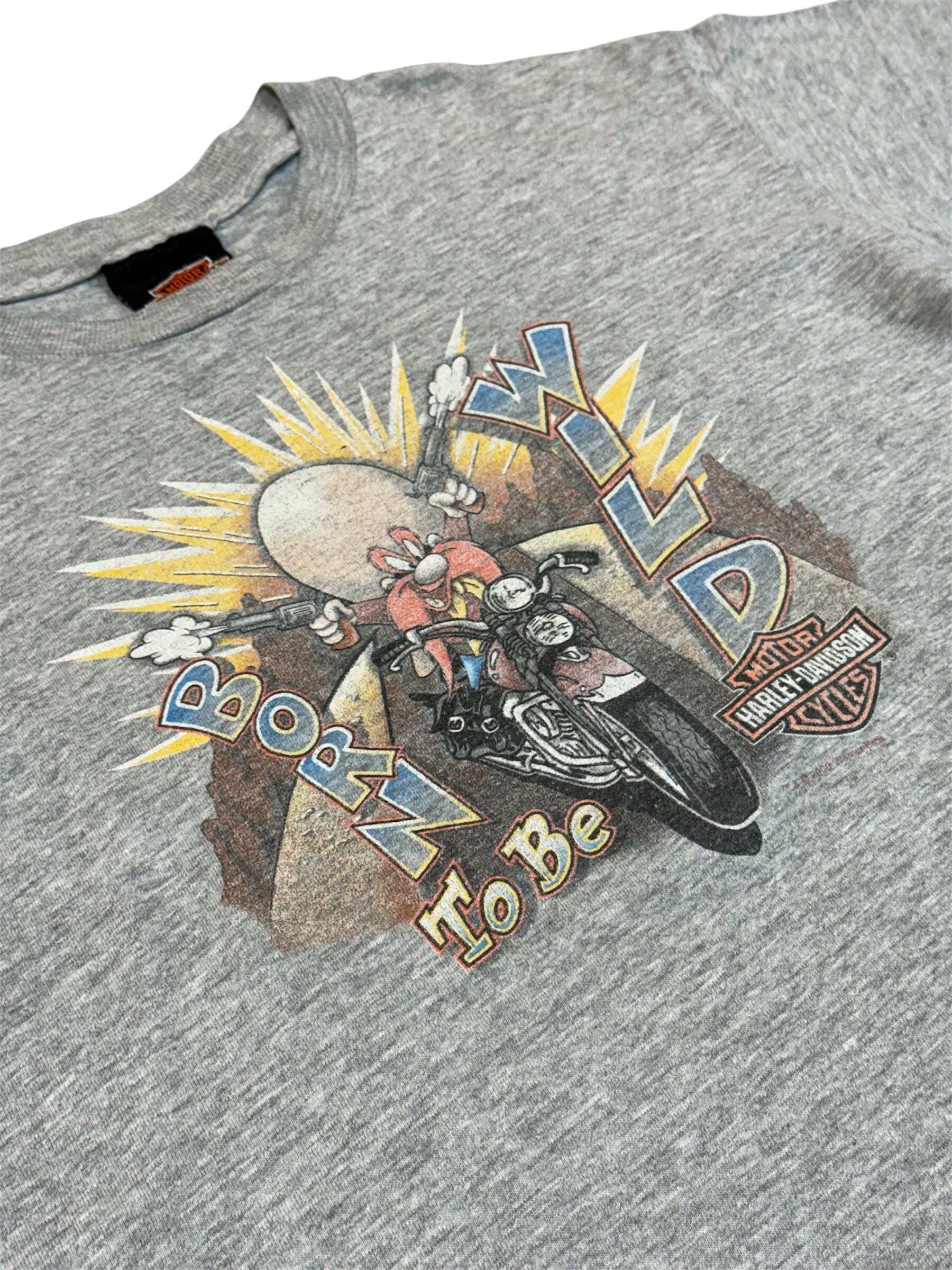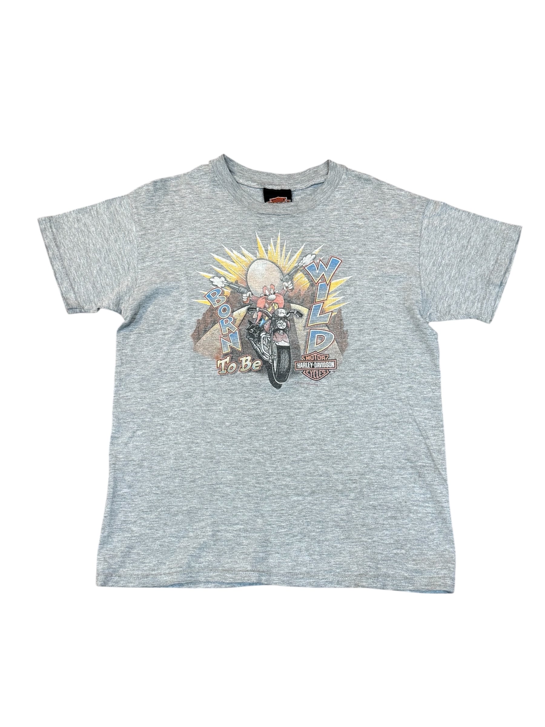 フロントには、二丁拳銃をぶっ放しながらハーレーで爆走する「ヨセミテ・サム」が、"BORN TO BE WILD"のテキストと共に描かれた最高にパンチの効いた一着です。